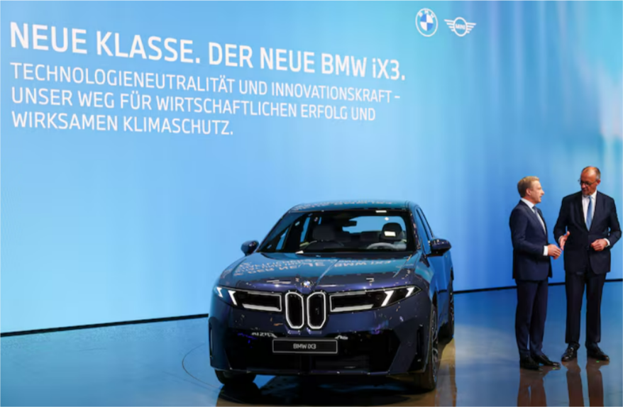 宝马集团首席执行官齐普塞在2025年慕尼黑车展上与德国总理默茨交谈 图源路透社