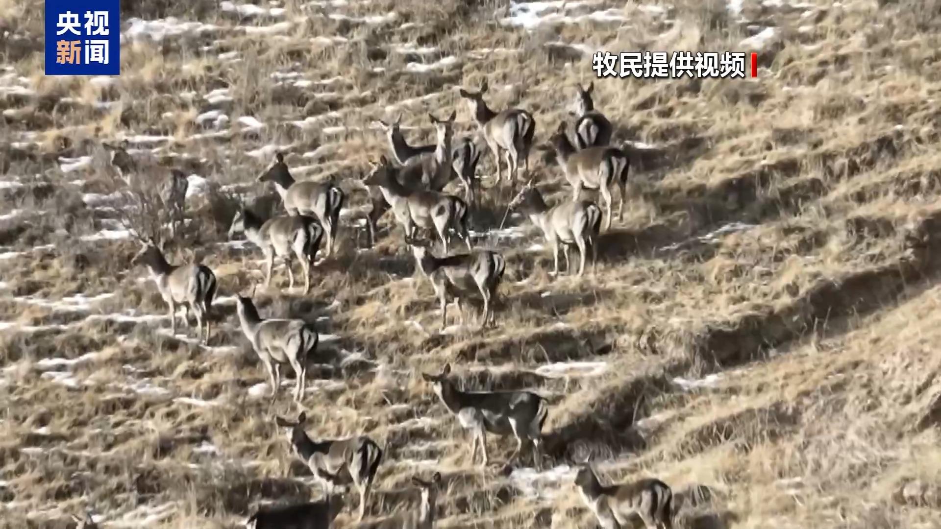 肃南裕固族自治县马蹄藏族乡牧民 尕满草:蓝马鸡、鹿爸爸、鹿妈妈带着它们的宝宝,可以很轻松地找到食物,不用去跳围栏折腾了。