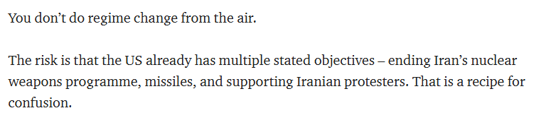 查塔姆研究所所长布朗文·马多克斯指出,风险在于美国设定了多个目标,包括终止伊朗的核武器计划和导弹项目,以及支持伊朗抗议者等,这势必会造成混乱。