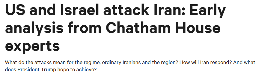 国际知名智库查塔姆研究所发文认为,美以军事行动未获联合国授权,且开创了“谈判未达目的就发动袭击”的危险先例,让未来的地区局势充满“未知风险”。