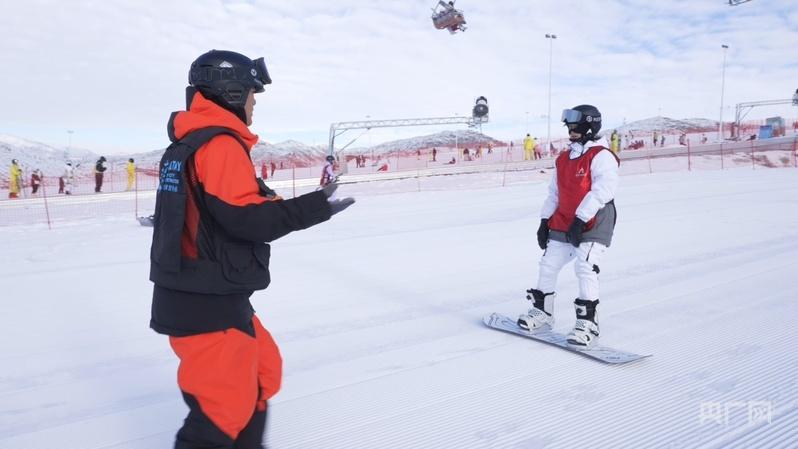 来自湖南长沙的游客李女士正俯身调整雪板,她告诉记者:“这是我第二次来到新疆过年,这次专门来到新疆体验滑雪的奇趣,这里的雪质比朋友圈里看的还惊艳。”