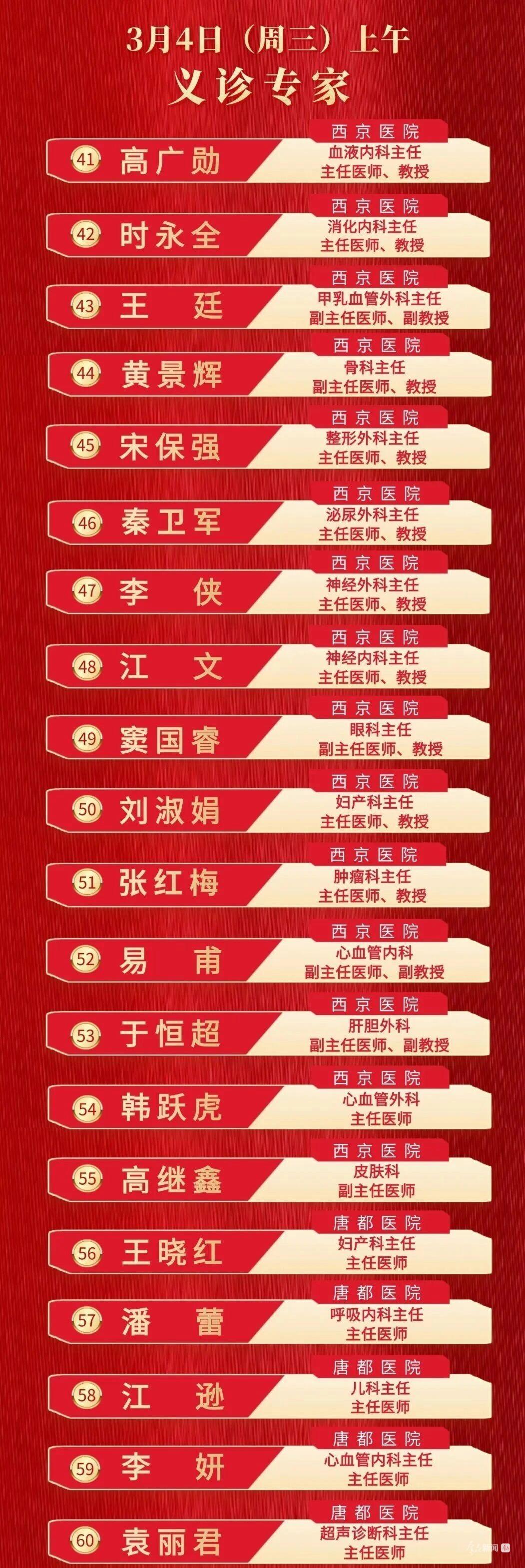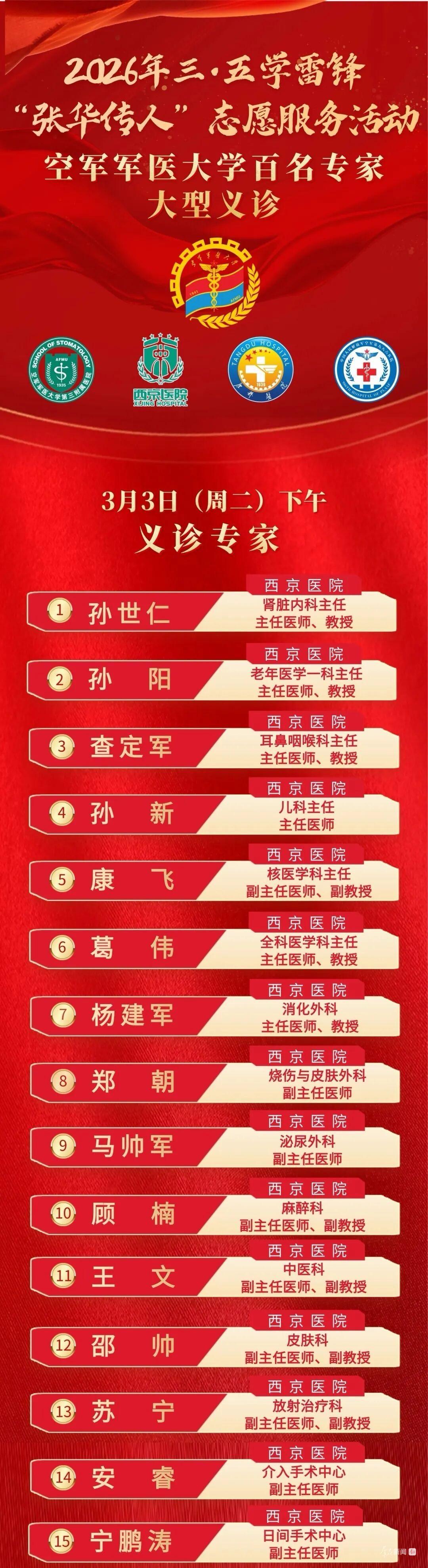为大力弘扬新时代雷锋精神,展现“张华传人”昂扬风貌,3月3日至4日,空军军医大学将抽组西京医院、唐都医院、口腔医院和九八六医院的百名专家教授组成志愿服务队,在大明宫国家遗址公园举办大型义诊服务活动。现场提供健康咨询、疾病诊疗、科普宣教等公益服务,以实际行动传承雷锋精神,践行军医使命,服务百姓健康。(群众新闻记者 郭诗梦)