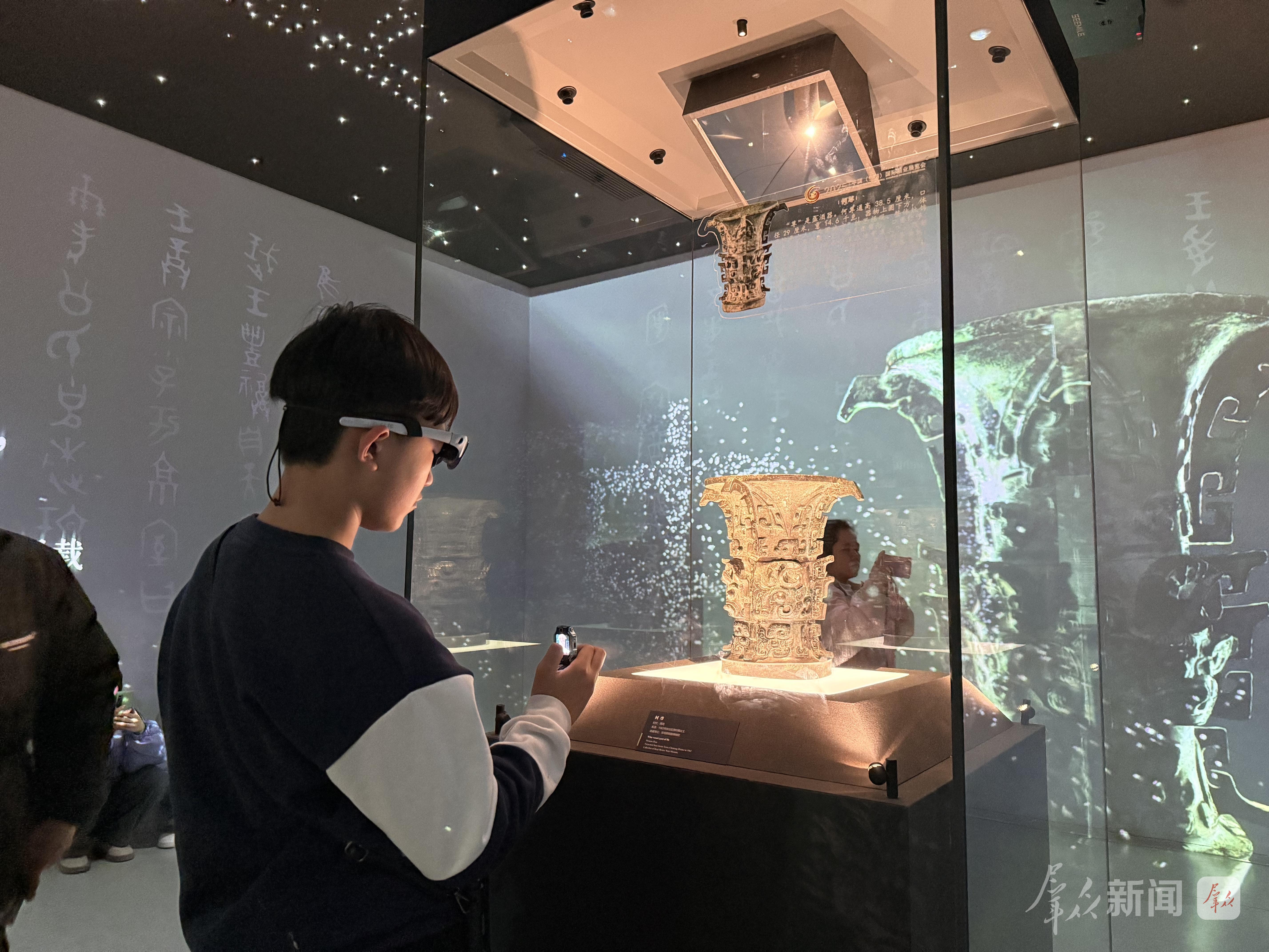不仅如此,科技与文物的融合处处可见:CAVE沉浸空间让观众瞬间“穿越”到周王室宗庙,在光影交织中感受礼乐文明的庄重;“魔墙”交互系统将馆藏文物数据库可视化,观众轻触屏幕,便能放大纹饰、细品铭文;AR眼镜导览则为个性化观展提供可能,让文物背后的故事“开口说话”。
