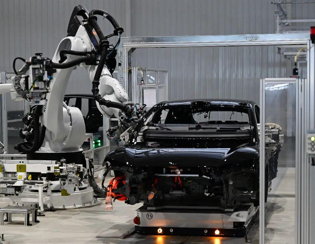 图为记者在安徽合肥市新桥智能电动汽车产业园蔚来第二工厂拍摄的新能源汽车生产线。新华社记者周牧摄