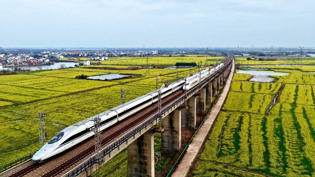 2月27日,江西南昌县,高铁列车从油菜花田边驶过。王超摄