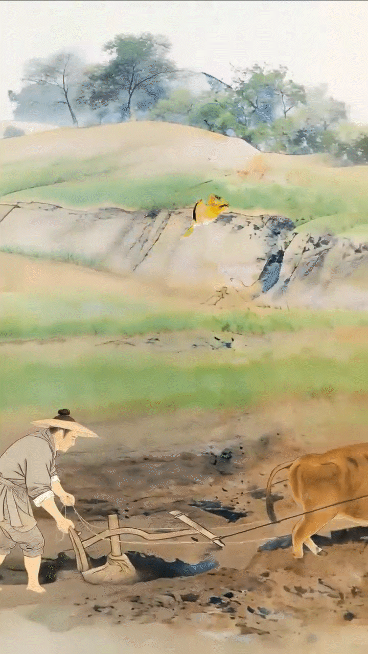 农民扶犁,牛蹄翻起新泥
