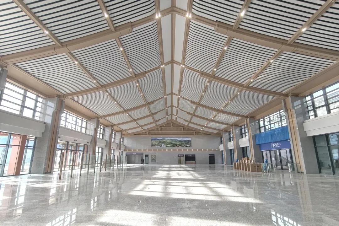 商洛西站位于陕西省商洛市。站房以“幽幽商山匿仙境,盈盈洛水诞尘间”为建筑创意,屋顶根据建筑功能高低起伏,与秦岭山脉独特的山形遥相呼应,蕴藏着南北文化交融的美好寓意。