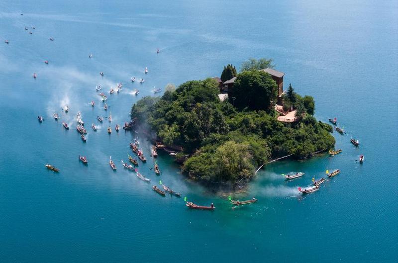 An aerial drone photo taken on Sept 16, 2025 shows local people sailing around an island while circling the lake by boat in Yanyuan county of Liangshan Yi autonomous prefecture, Southwest China's Sichuan province. [Photo/Xinhua]