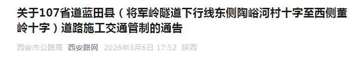 根据西安市交通运输局批复,西安市公路局将对107省道K80+289-K80+339路线将军岭隧道下行出口东侧滑坡进行水毁修复施工,根据《中华人民共和国道路交通安全法》、《中华人民共和国道路交通安全法实施条例》的有关规定,为保证工程顺利实施,保障周边群众及过往车辆安全,现需对107省道K79+864-K82+082段进行半幅封闭施工。现告知如下: