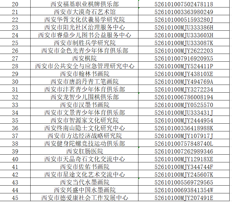 经查,西安高新区环境保护研究所等45家社会组织存在连续两个年度以上未接受年度检查的行为,违反了《民办非企业单位登记管理暂行条例》第二十三条第一款的规定。依据《民办非企业单位登记管理暂行条例》第二十五条第一款第(三)项的规定,适用陕西省民政部门行政处罚裁量权基准(2024 版)(陕民规〔2024〕3号)中从重处罚情形,本机关现对以上社会组织作出“撤销登记”的行政处罚。同时,按照《社会组织信用信息管理办法》第十五条规定,将西安高新区环境保护研究所等45家社会组织列入社会组织严重违法失信名单。