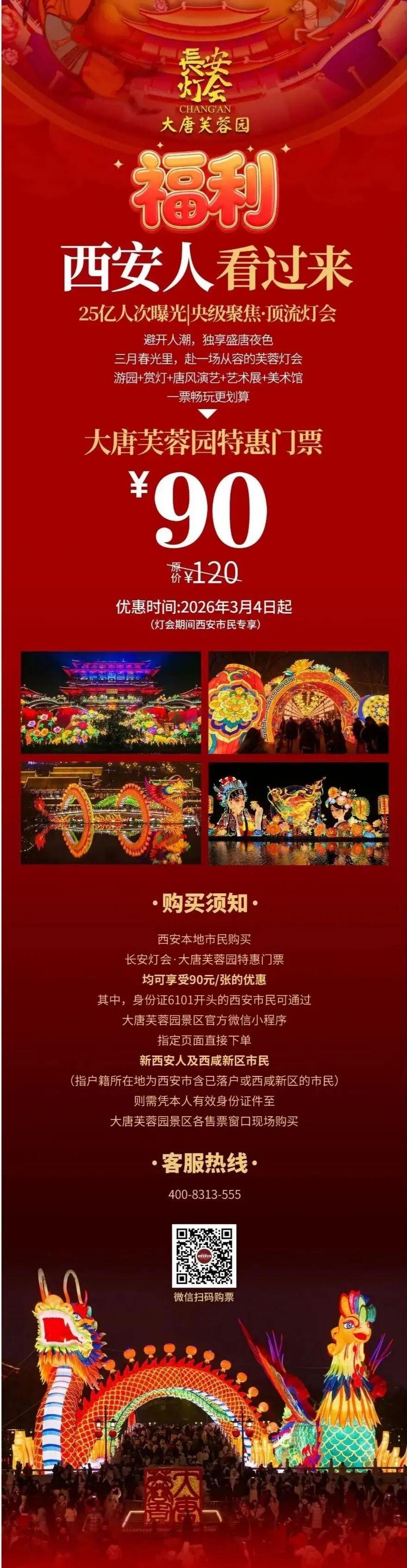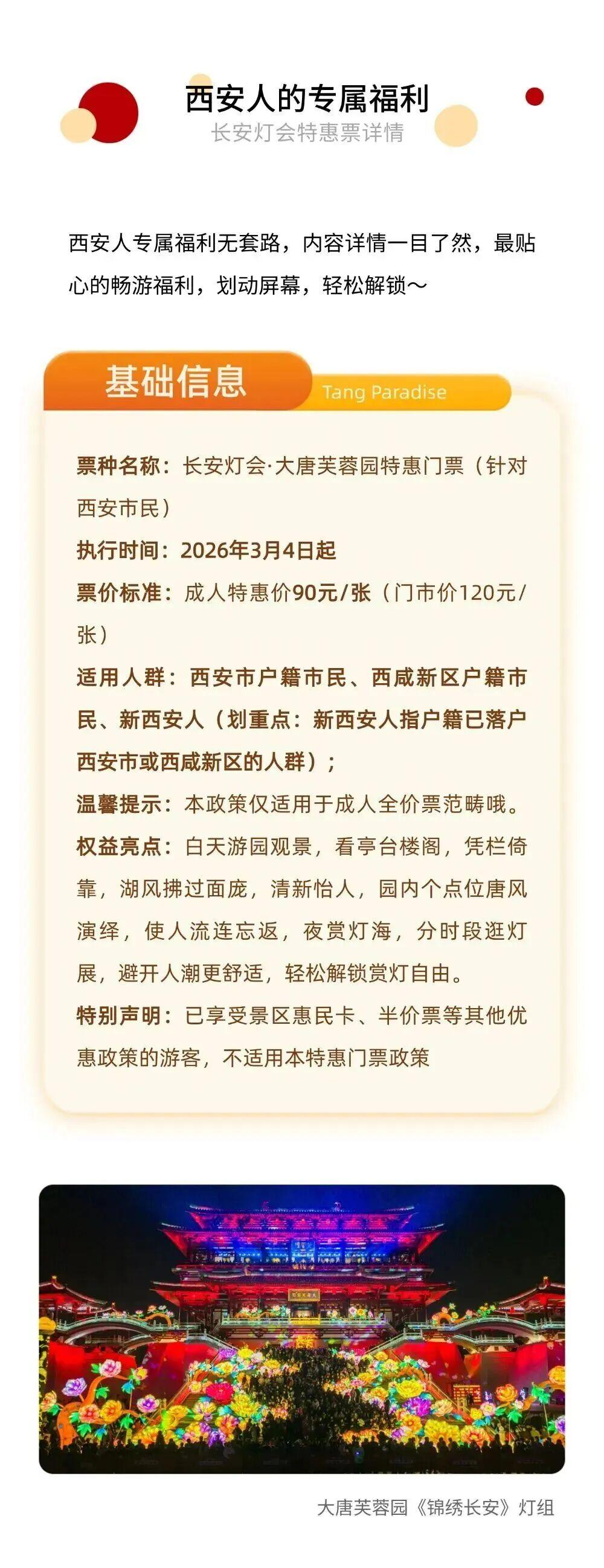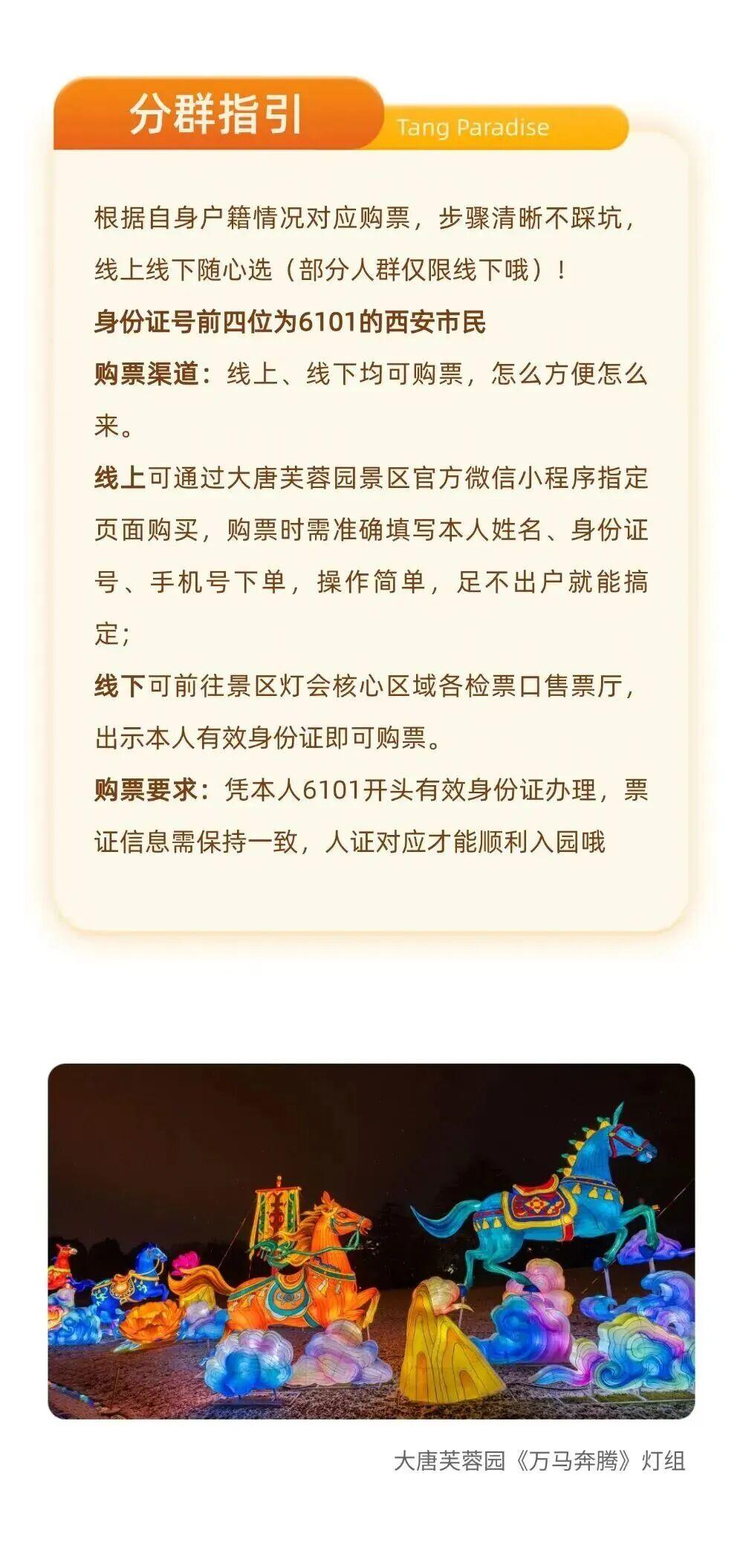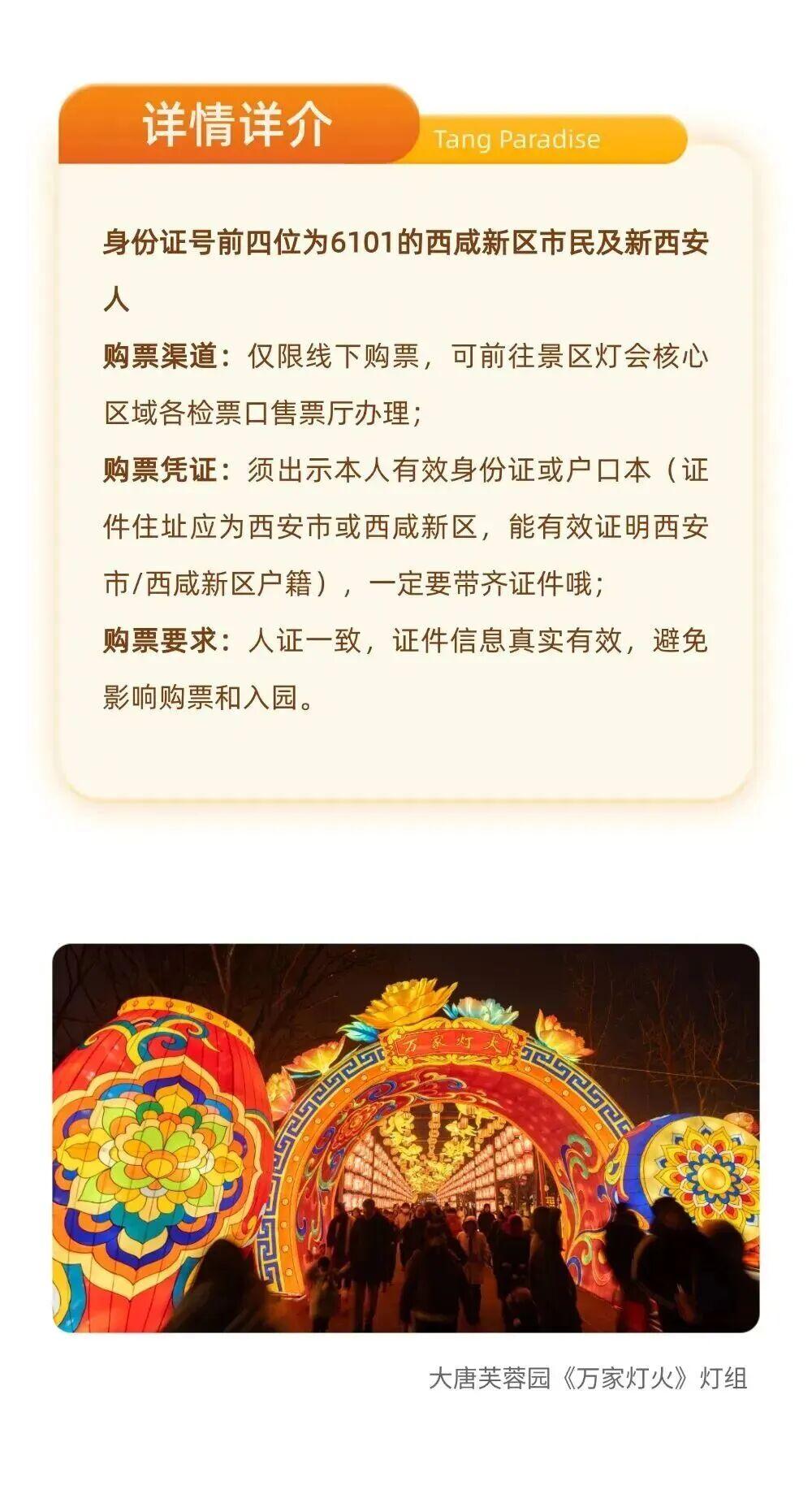 补差渠道:可前往景区灯会核心区域指定补差点位,出示本人西安市/西咸新区户籍证明(身份证/户口本)及54元成人全价票相关凭证,即可办理补差。