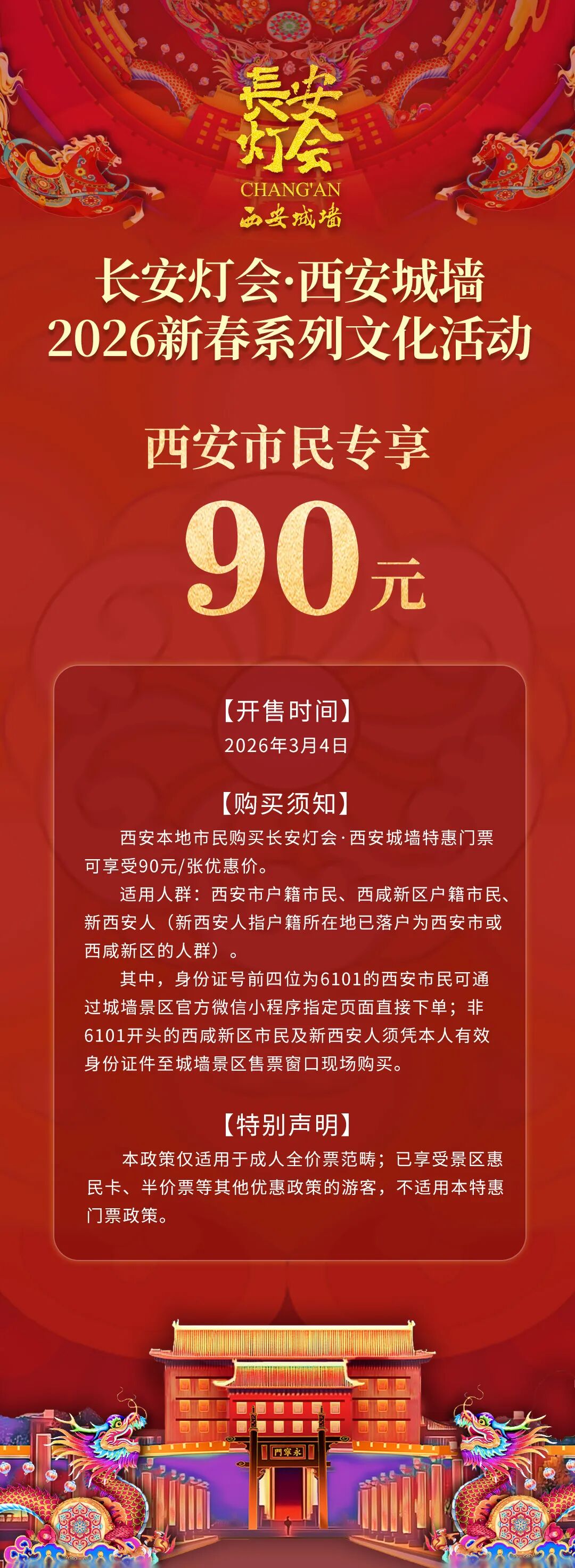补差适用人群及条件:符合本公告特惠门票政策的西安市/西咸新区户籍市民,使用54元成人全价票后,行至灯会核心区时,可购买36元专属补差票后进入。