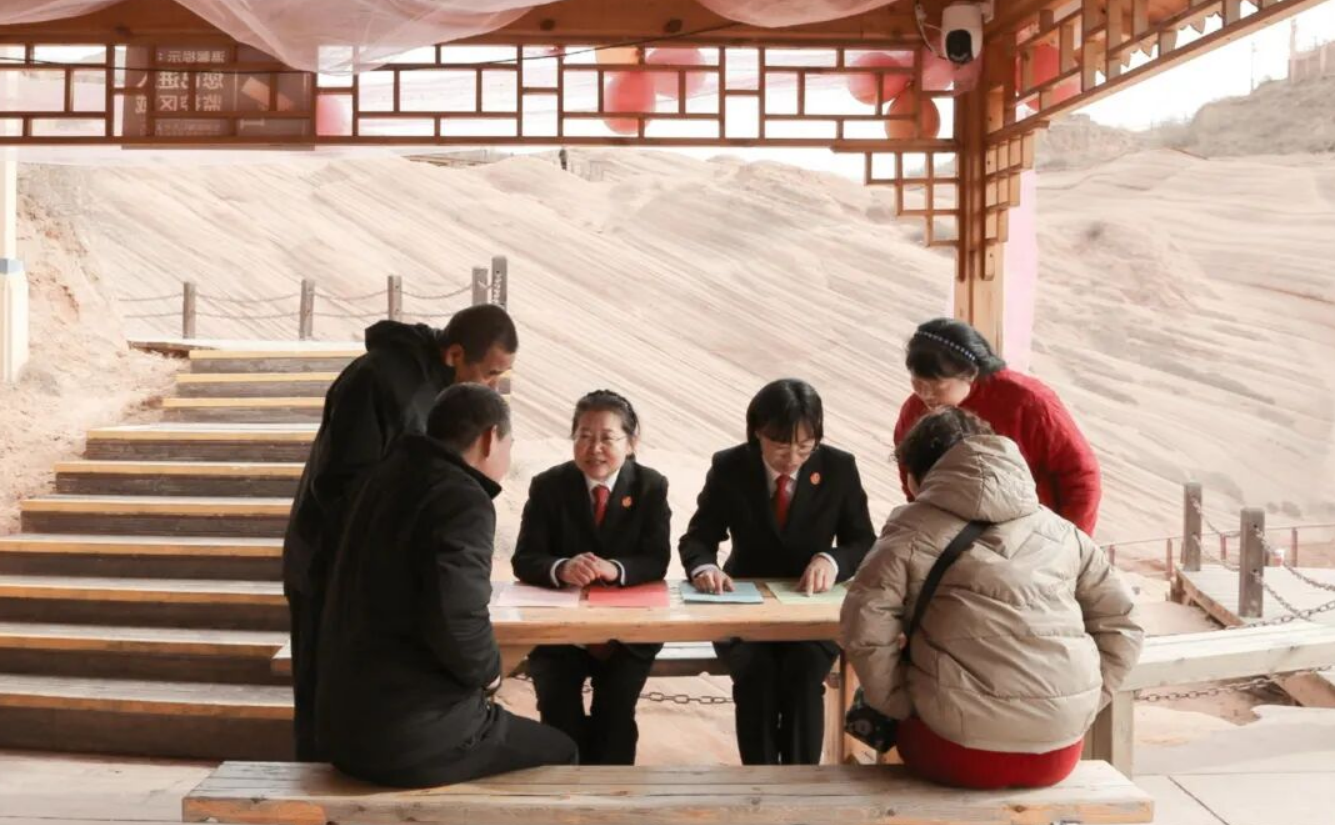 上午的龙洲波浪谷,丹霞红岩与“司法蓝”身影交相辉映,构成一道独特的风景线。在景区核心区域,靖边县法院女干警们支起“法治小摊”,拉开“巾帼维权她力量 法治春风暖万家”普法宣传活动帷幕。