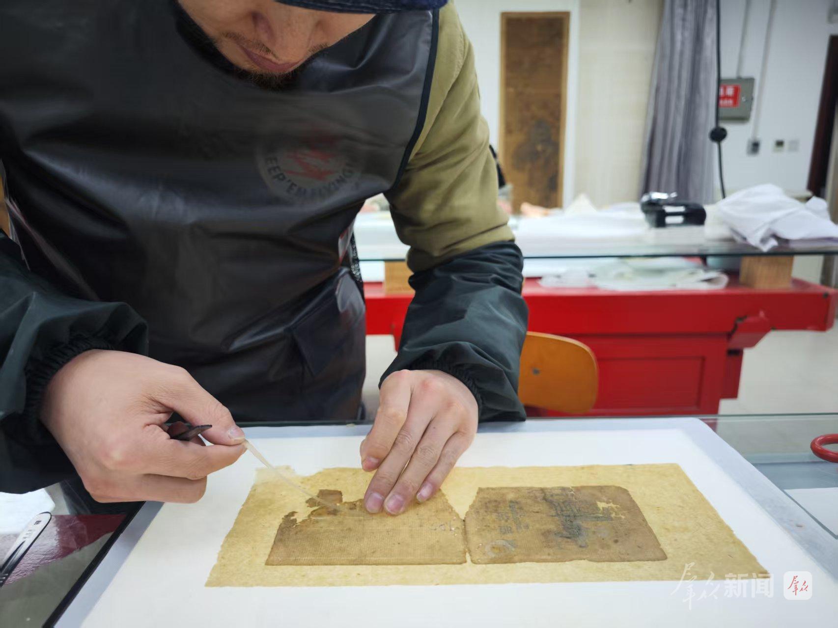 选纸、染纸、拆钉、分册、舒展、加固……一系列繁复的修复工序后,文献终于脱离濒危状态,展露真容。轻薄通透的典具帖,让书页残片更加稳固,且不遮挡文物信息,丝毫不影响观赏。