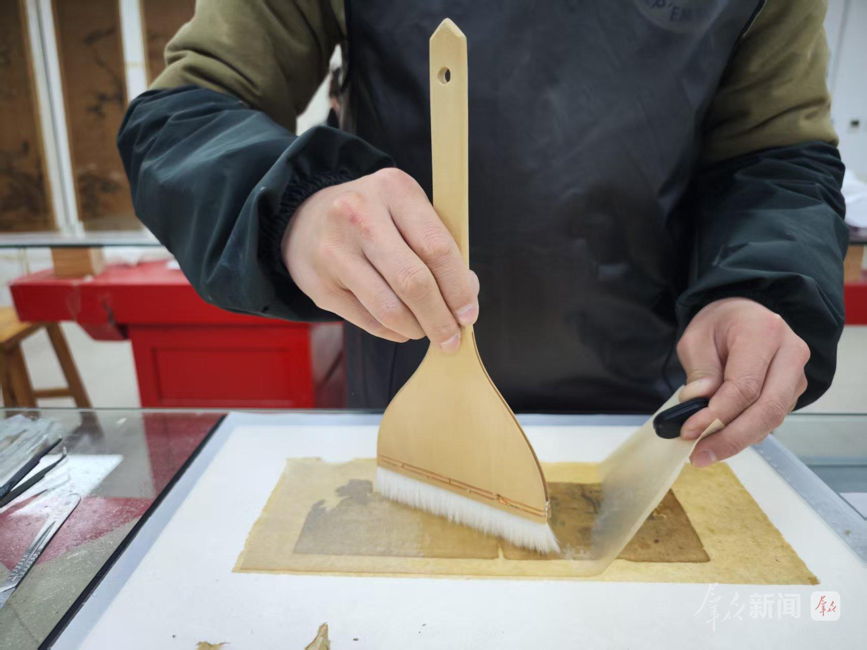 怎样修复才能更好保持书籍原貌?马琳燕和团队反复斟酌,最后决定采用一种叫“典具帖”的薄纸,将之用糨糊粘贴在书页絮化糟朽的破损边缘,对残损部位进行永久加固。