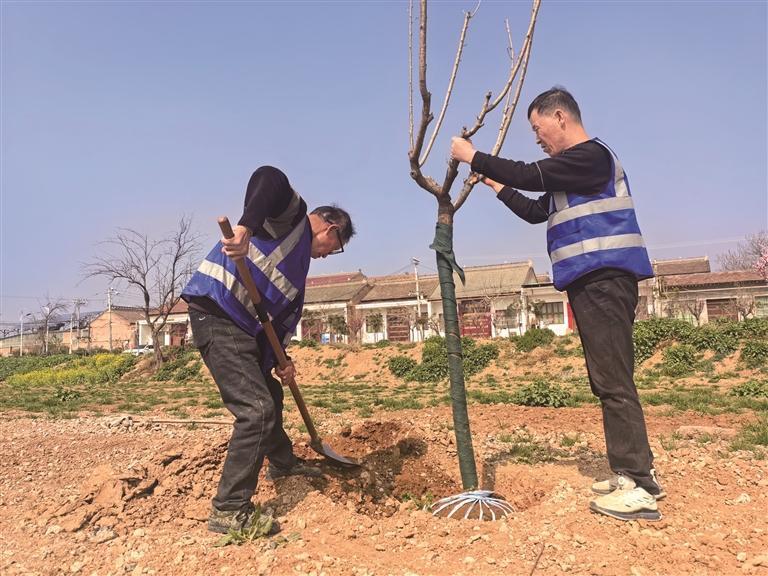 “扶稳树苗,土要填实,水得浇透,樱花树才能扎稳根、长得旺!”3月11日,堡里村村民高万强一边手把手指导邻里培土,一边叮嘱。挥锹铲土、扶苗正冠、填土压实、提水浇灌,一道道工序有条不紊。
