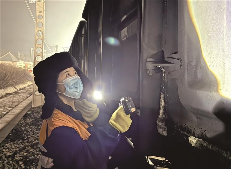 3月初的陕北,春寒料峭。3月7日5时许,城市还在沉睡,靖边东站的股道旁,李琬祯已俯身穿梭在万吨运煤列车间,仔细检查着每一处车体细节。