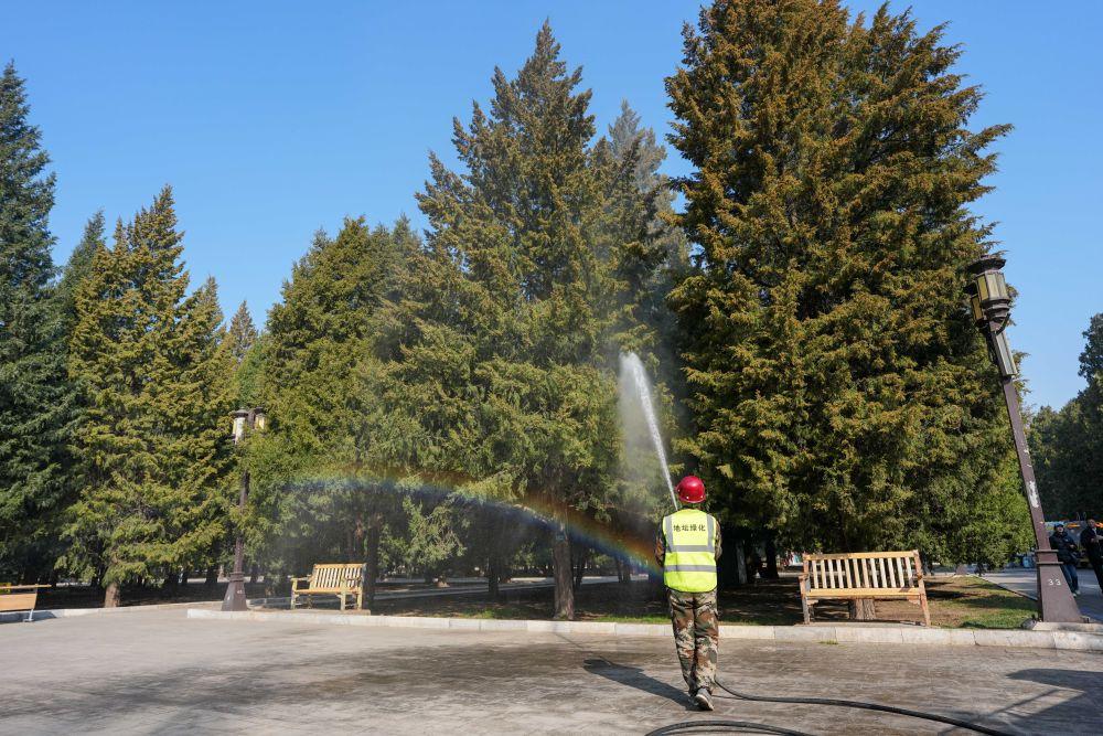 3月15日,在北京地坛公园,工作人员使用添加了花粉控制剂的水对柏树进行喷淋。新华社记者 鞠焕宗 摄