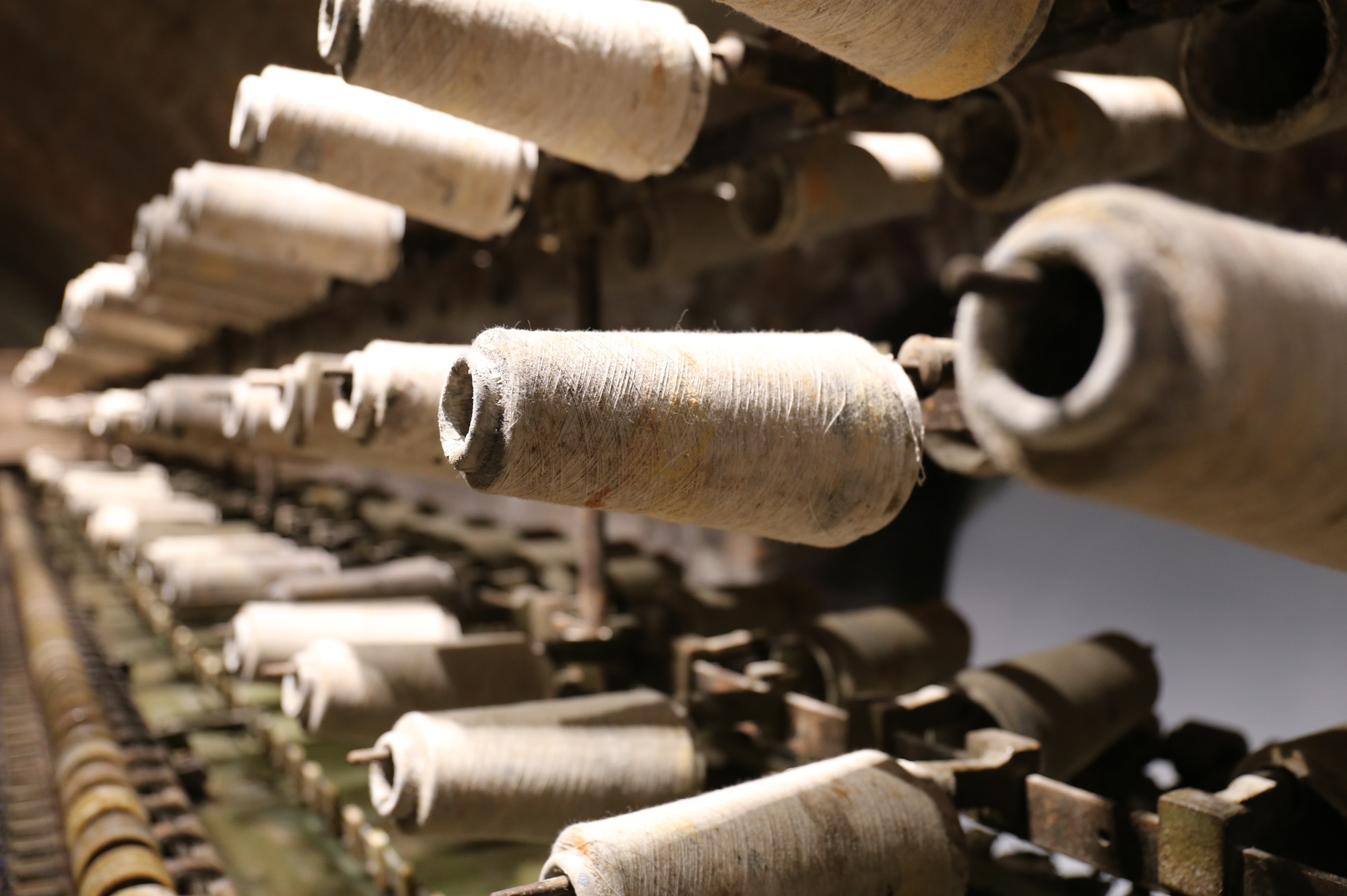 窑洞工厂内纺纱机器上的纱锭。