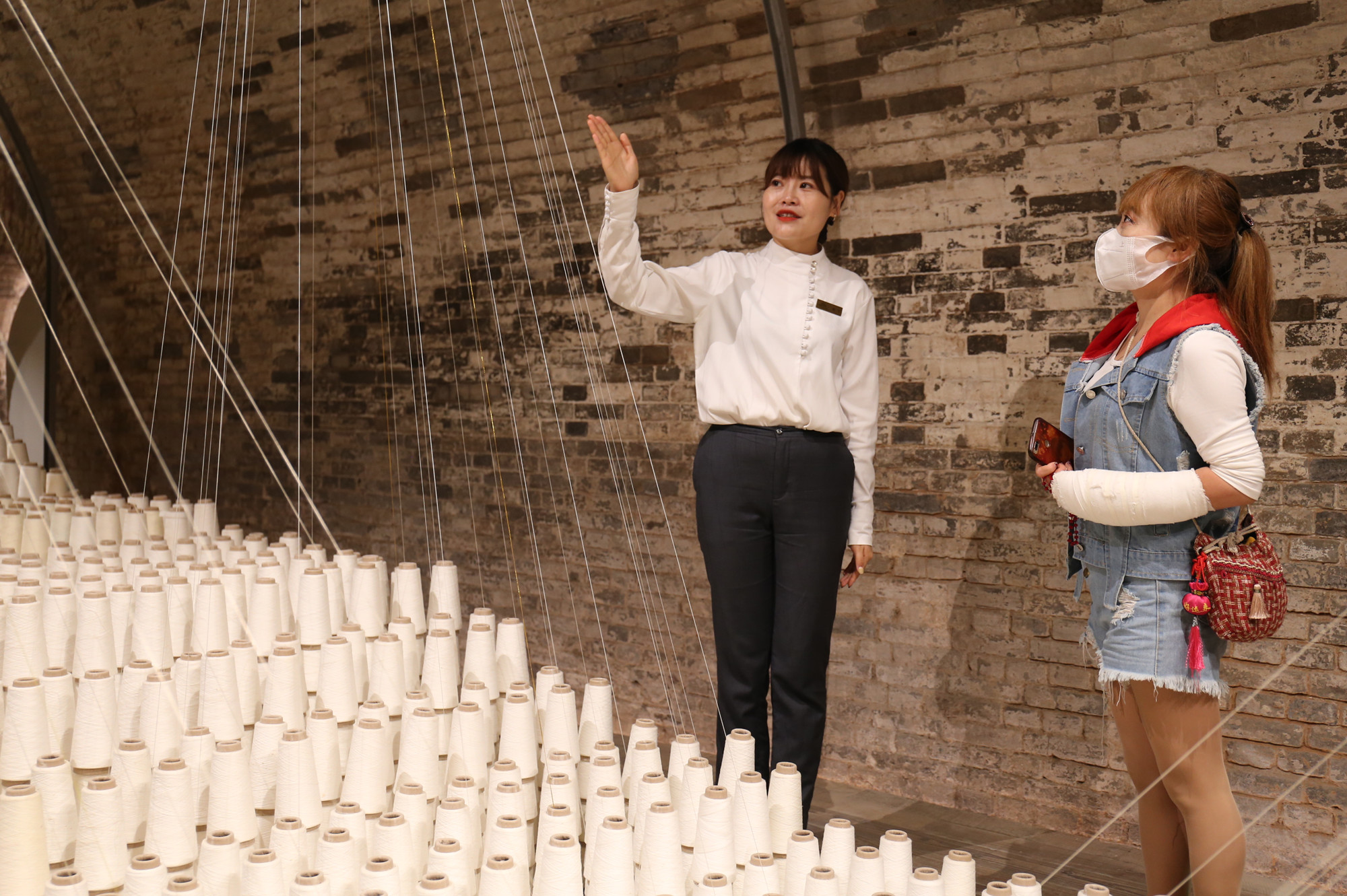 胡雪在"十万纱锭十万人"装置艺术前为游客讲解。