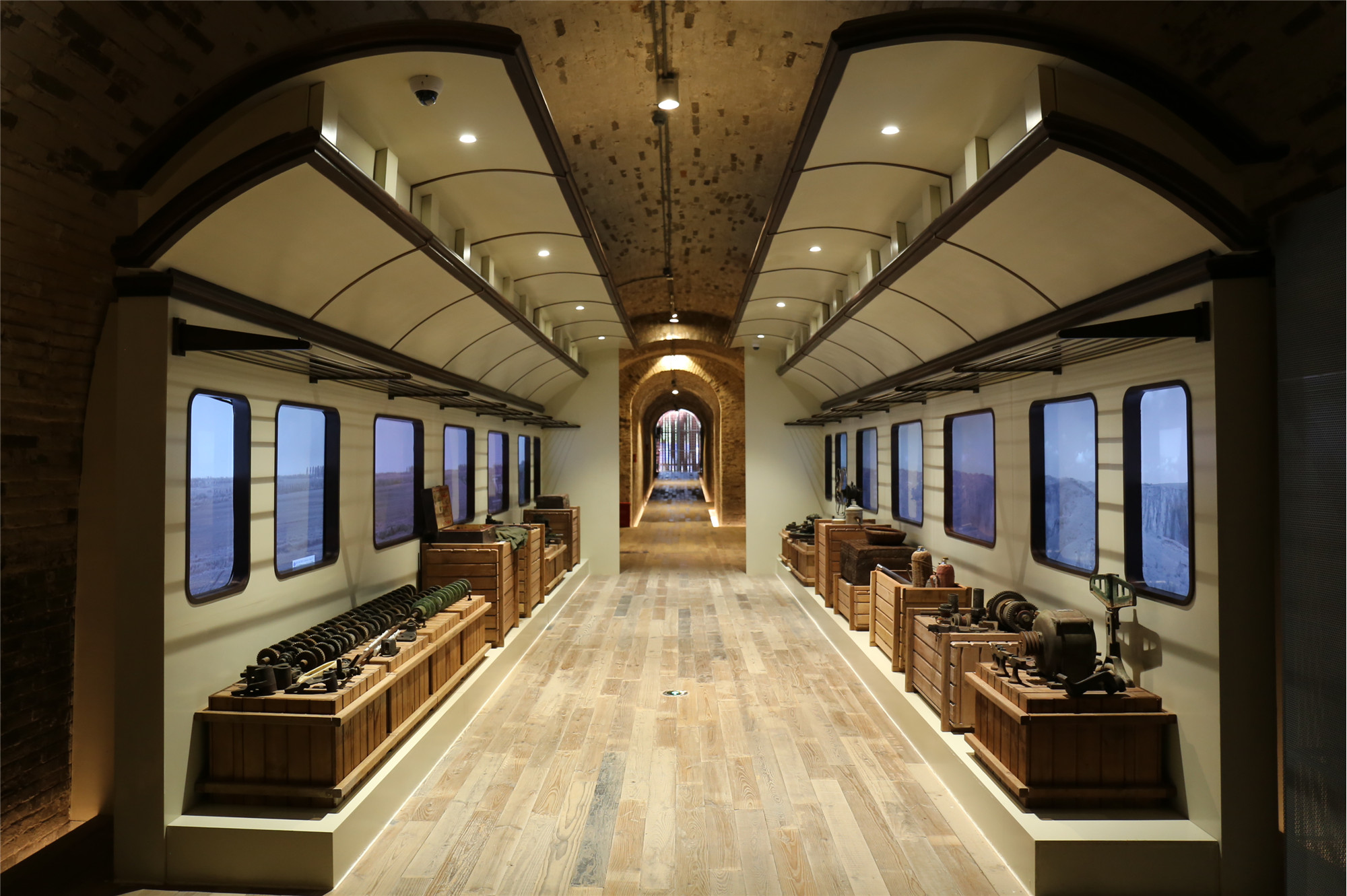 宝鸡的申新纱厂被称为"火车拉来的窑洞工厂"。这是仿火车厢拉来机器零部件的设计景观。