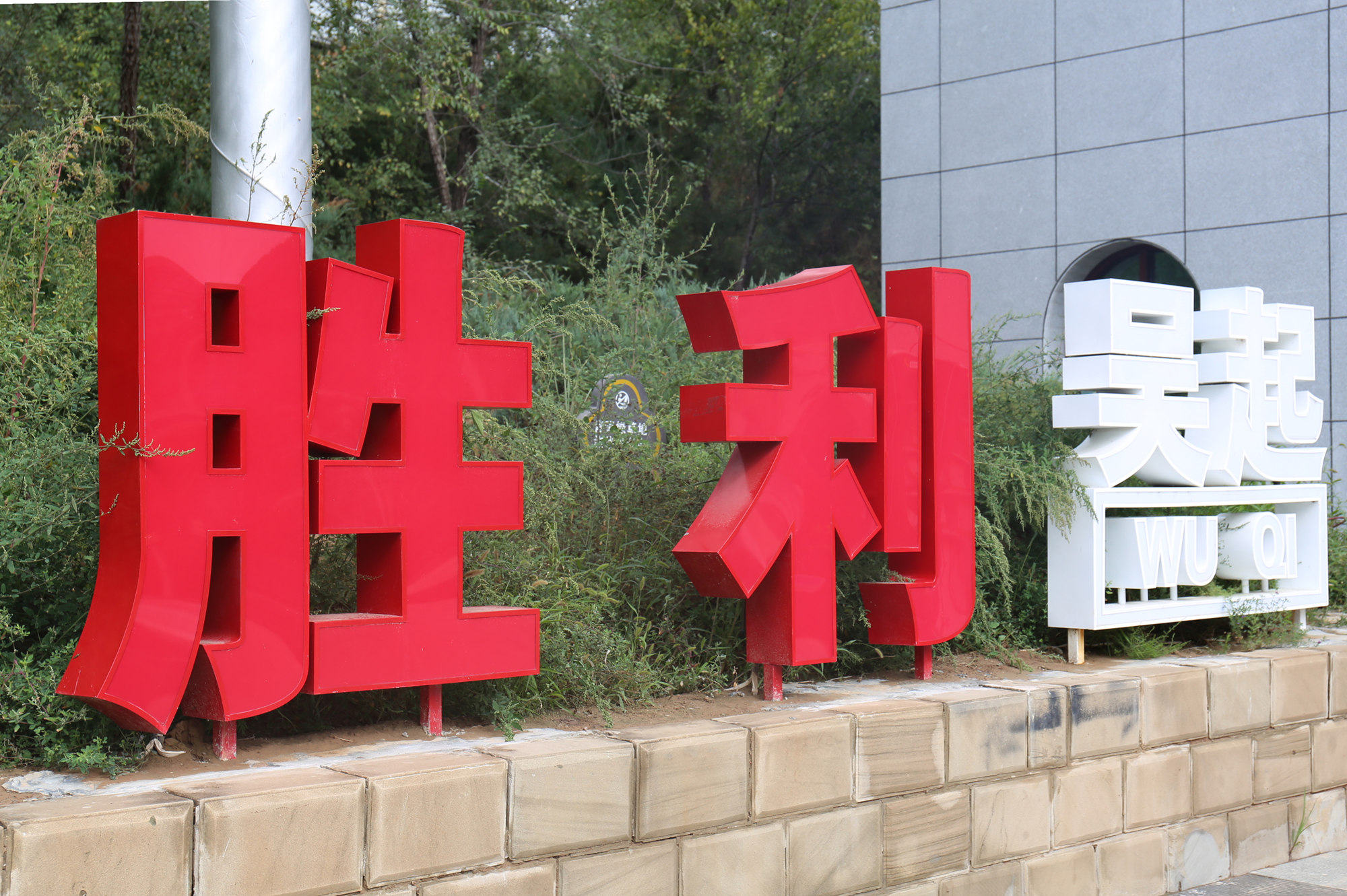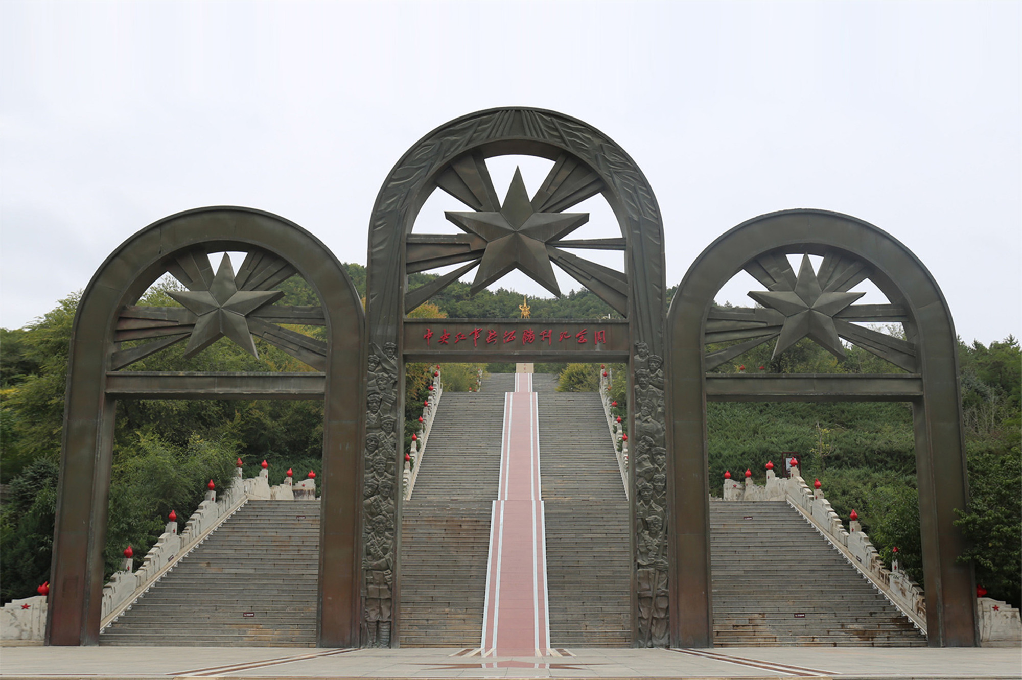 由三个连续的陕北窑洞铜门造型组成的胜利山的入口胜利门。在胜利门上放着光芒的五角星是胜利的象征。