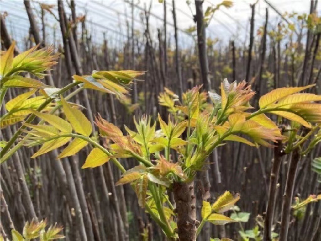 走进临渭区丰原镇香椿园,空气中弥漫着香椿特有的清香,一排排栽植整齐的红油香椿树生机盎然。